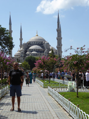 Of course, I have to wear a very pretty blue scarf that matches my dress and Alain had to wear some pants. We take off our shoes before entering the mosque as well. We had to queue for about 40 minutes, but it was worth it. Like many mosques we have visited, this one although very large strikes us as being very spacious and sober. The walls have been covered with blue earthenware of Isnik. Roses, carnations and tulips are represented in different shapes on the earthenware. We are however surprises to see that much rose colour in the mosque. In our mind, it was blue.... surprised, but not disappointed!